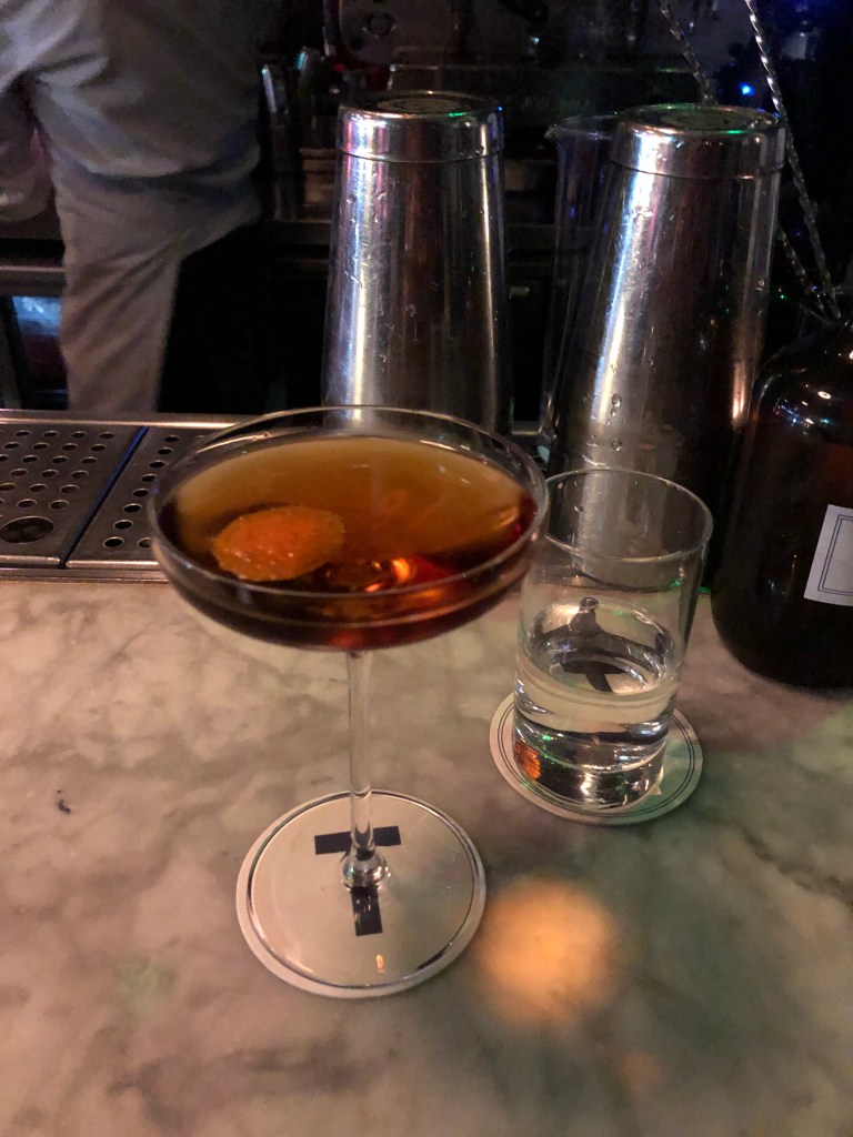 I asked for a light digestif, and the bartender made me a lovely Adonis – deep red again, but with a warmer hue. A table of two was ordering Espresso Martinis in perpetuity, and the bartender, pausing after the drinks had been served, set an espresso cup in front of me with the shaker’s little bit more. They kept me company in the quietness, the staff rolling off each other in Italian, pointing a question in my direction on occasion.