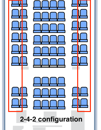 Image on left: 3-4-3 seating configuration; image on right: 2-4-2 seating configuration. Ideal seats indicated in red.