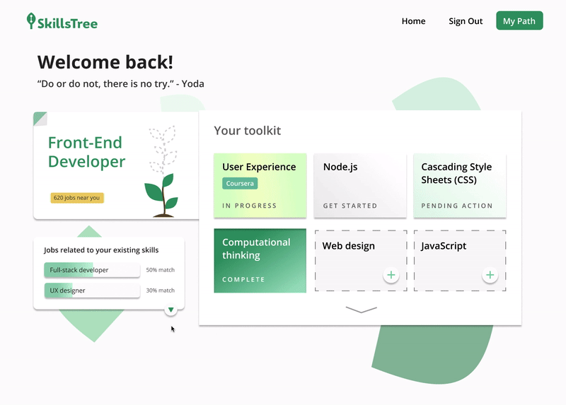 The goal of SkillsTree was to upskill the unemployed population via online course providers like Coursera and edX, and match them to high-paying tech companies via a proprietary AI.